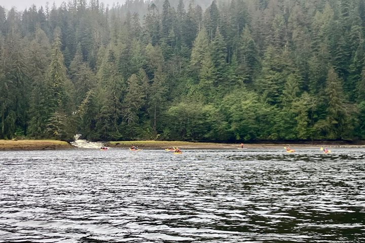 Our last day in the Great Bear Rainforest proved to be one full of excitement, education, and awe. After dropping anchor in the idyllic glacial fjord of Green Inlet, we set out to explore the rocky shoreline and forested granitic fjord walls. The dense fog gradually turned into a wispy mist, which exposed different peaks and valleys of the forest as it moved through. We took turns kayaking through a delightful cove that was loaded with ochre sea stars, rockweed, and blue mussels so thick and dense that the rock they were attached to was hardly visible between them. A river otter scurried along the shore and bald eagles soared above us. From the Zodiacs we visited nearly a dozen thunderous waterfalls that were running hard and fast from the heavy overnight rains. We observed harbor seals observing us back; they were quietly periscoping their furry heads up and out of the water as we approached the rapids where they were hunting salmon making their final journeys upriver to spawn. Upon our return to National Geographic Venture , expedition diver Nick Brown shared his extensive underwater video footage from the area. His presentation was interrupted, of course, by whale sightings, which we rushed onto the bow to appreciate.
