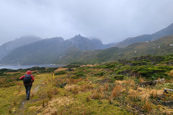 Bahía Franklin or “Franklin Bay” is as much a picturesque anchorage as it is a wellspring for wildlife on this part of the globe. After a night cruising down the Beagle Channel and into the South Atlantic, we arrived just as the sun broke from a scattering of clouds. Because of the generally torrential conditions, National Geographic Orion has only succeeded in landing twice before at this location. Our natural history staff led hikes through the tussock grass to a nearby rockhopper penguin colony. This is the largest and southernmost colony in South America, with approximately 127,000 nesting pairs. Slightly less plentiful are the charming burrowing Magellanic penguins, who also favor the island’s temperate climes. Recent counts show their numbers up by 50% in the last 10 years, with approximately 1,600 nesting pairs.