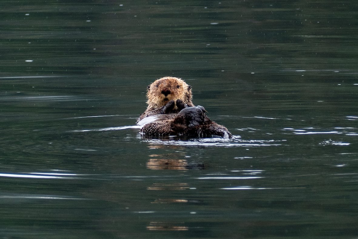 During the morning, we explored the scenic cove of Pavlof’s Harbor on the southeast shore of Freshwater Bay, Chichagof Island, and area known for its healthy salmon stream. We were optimistic that we might still see a bear during our last day exploring Southeast Alaska. We were not disappointed! At the base of a small waterfall, we spotted a coastal brown bear casually gorging itself on salmon as we watched, spellbound, from the safety of our expedition landing crafts only a few yards away. The bear, enjoying its meal, seemed oblivious or at least indifferent to our presence. For nearly an hour, we watched the animal devour fish after fish until it calmly walked up the river bank rocks and into the forest. Late summer and early fall is the time to fatten up and prepare for the long winter ahead. Come November and the onset of snow, brown bears will leave the coastline and head to higher elevations near or above treeline. Biologists debate whether bears truly hibernate or just den up and sleep during the winter. Pregnant sows will give birth to tiny, one-pound cubs while sleeping within the den and nurse them until spring. We returned to the ship after our morning adventures for lunch and were relaxing in the lounge when another bear was spotted on the beach south of Pavlof Harbor. Although more distant than our first encounter, we all enjoyed another exceptional sighting of a coastal brown bear. But the wildlife viewing wasn’t over yet! As we sailed south along Chatham Strait, we encountered a pod of killer whales swimming nearby. Crusing alongside the pod, we counted a group of about ten that included one large male. His large dorsal fin rose nearly six feet above the water‘s surface. Guests spent the remaining time reading or chatting with friends. We wrapped up our day with the captain‘s dinner followed by the guest photo slideshow, which we enjoyed as we sailed toward Sitka through Peril Strait. Have we seen it all? Hardly! But we left with a sense of fulfillment, knowing that we saw a lot! And maybe one day we‘ll return and finally see some elusive moose!
