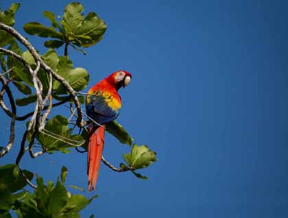 During the evening we traveled further up the Ucayali, one of the many tributary rivers that form the mighty Amazon. Here the current is much less obvious because the river has widened a considerable distance. There is also much less terra firma and we are exploring the flooded forest deeper in the upper Amazon Basin. We had an early morning start in order to be out just after sunrise when the wildlife would be most active, and the early wake-up was well worth the effort. We would be heading to Belluda Caño to explore the narrow waterway, but first a stop along the main river to try to find blue and yellow macaws. When we arrived at the place where some dead palm trees were used as nest sites for the magnificent birds all was quiet. Slowly we motored along the shore searching the treetops for any sign of our prey. We all were a little worried our quest would be in vain when all of a sudden the macaws arrived with a raucous call as if to tell us, “Yes we are late, but we are here now so let's get on with it!” Watching them fly is like watching a palette of watercolors paint a swarth of color across the forest.