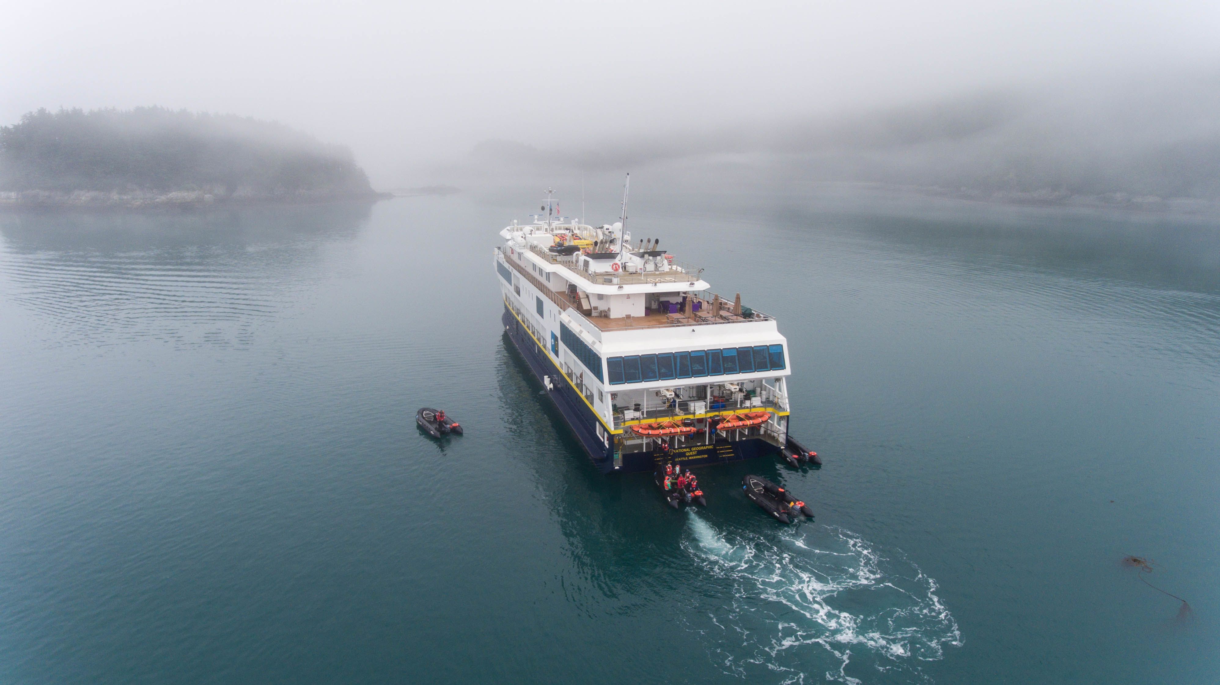 We woke to pretty clouds above the tree-covered hills as we sailed into Idaho Inlet, seeking wildlife. After breakfast, we landed at Fox Creek and hiked into a small waterfall along a salmon stream, through stately spruce and hemlock trees. The temperature was cool in the forest and black-capped chickadees sang to us as we walked along. Kayakers paddled in a beautiful cove with mirror-like waters, and other guests headed out on a cruise along the shoreline to search for wildlife and birds. It was a stunning morning. We sailed to the Inian Islands anchorage during lunch, and soon we were launching our expedition landing crafts to explore. The waters of the Inian Islands and Cross Sound are rich with nutrients due to the mix of upwelling currents and flooding tides, providing a wonderful food source for marine wildlife and seabirds. On this wonderful day, we saw Steller sea lions, sea otters, many humpback whales, and a minke whale. Late in the afternoon, we sailed over near Elfin Cove and went ashore to explore this picturesque and quaint fishing village on foot, making friends with the local dogs and talking with fisherman as we walked along the boardwalks of town.