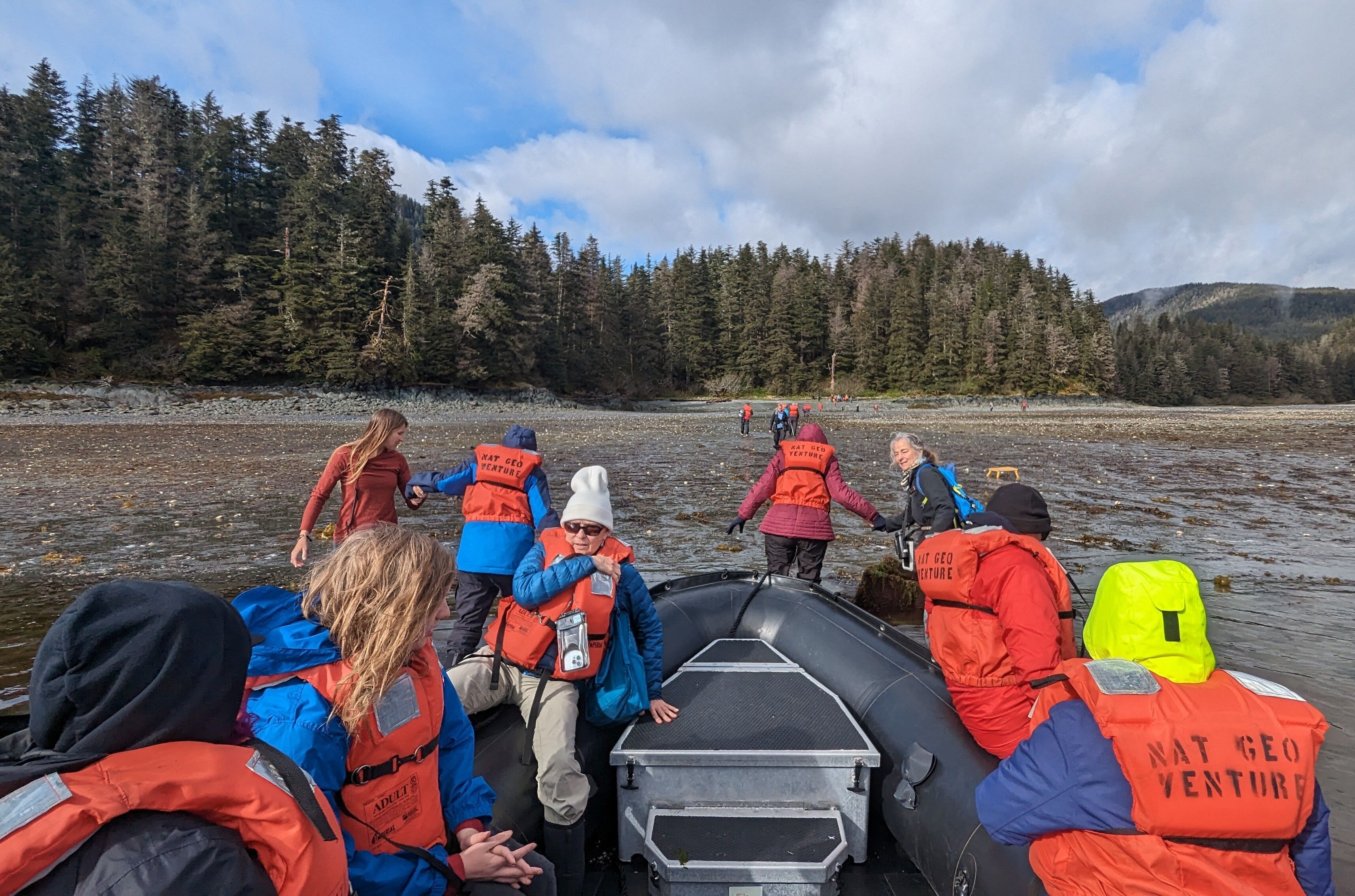 Landforms with names that evoke the divine tend to be hits aboard Lindblad Expeditions’ ships, and God’s Pocket is no exception. We cruised into this section of Misty Fjords through a light drizzle. The day’s highlight was Zodiac cruising, where wildlife stole the show. River otters ran through flocks of common mergansers resting on the waterway’s muddy banks; minks snaked through the maze of rocks along the shoreline looking for a tasty morsel; harbor seals bobbed on the surface. We even observed two Sitka black-tailed deer swimming from one island to another, perhaps beating the heat of the midday sun (which arrived to the delight of all).