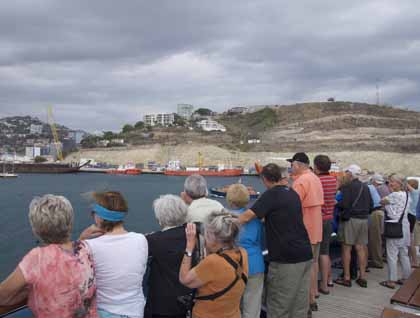 We proceed on into the lock at Bonneville Dam. Our sailors expertly throw a line over a floating bollard on our starboard side and this keeps our ship fast to the side of the lock as the great barn-door gate closes behind us and the lock begins to fill with water. The water flows in and the ship begins to rise in the lock. Meanwhile, we are gathered on the bow and we sing a rousing version of Roll On, Columbia Roll On, led by our expedition leader, Rab. Soon the water in the lock is at the level of the lake behind the dam, and the sailors take off the line and we sail forth 90 feet higher than before. Our sharp-eyed staff member, Jeff, spots a California sea lion bull; this animal has also come upriver through the lock.