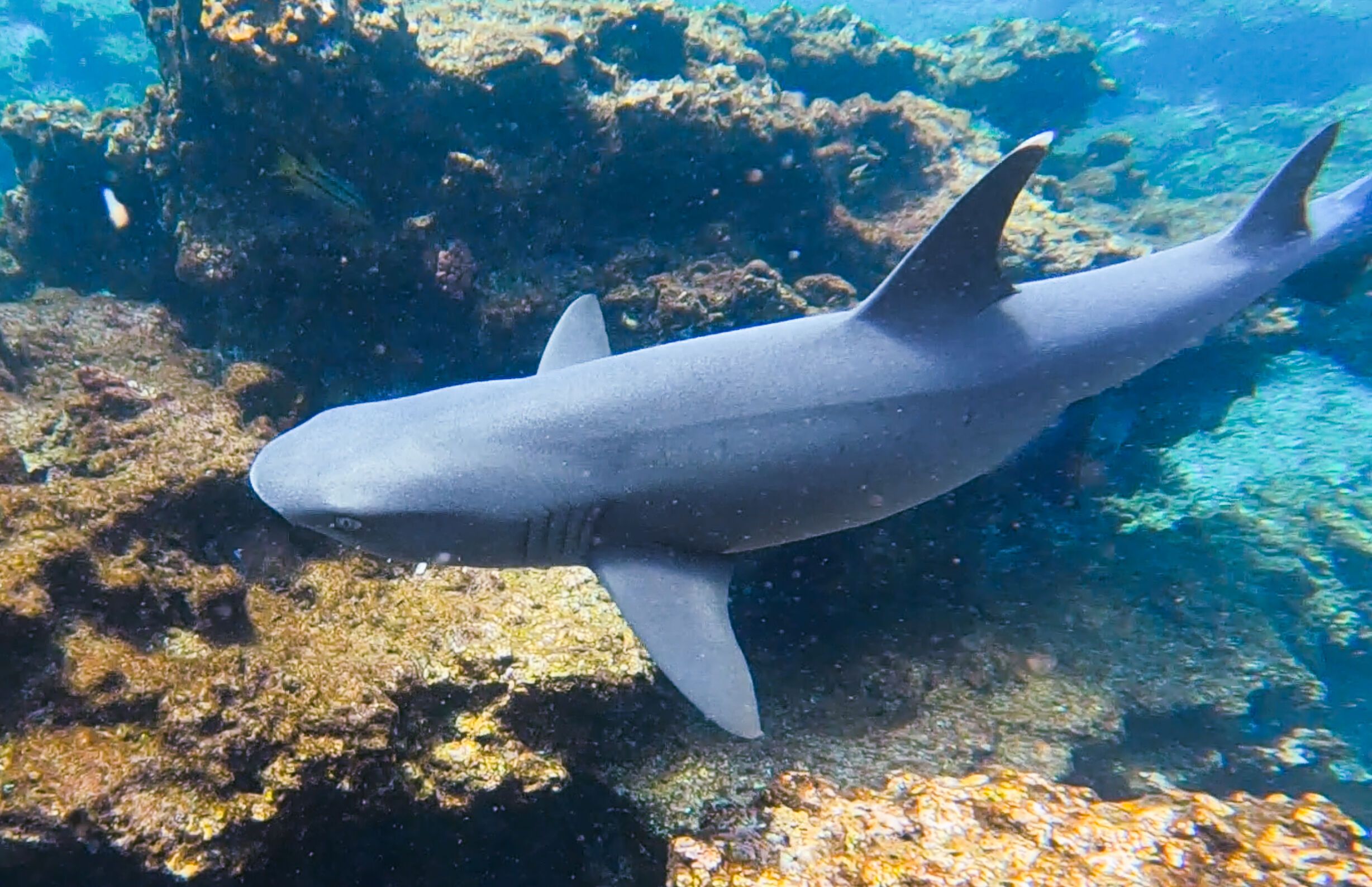 In the afternoon we kayaked and snorkeled in the beautiful cove on the north of Isabela Island. Tagus Cove was once used by whalers and has a lot of human history. This location is a sheltered area where sea turtles, penguins, and cormorants can be found. We explored the cove in Zodiacs and also hiked to the top of an ash cone.
