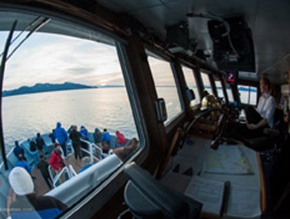 During the afternoon we sailed south around Douglas Island and up Stephens Passage in search of whales. We found a couple of humpbacks, and once again a large number of killer whales, the tall dorsal fins of the males gleaming in the late afternoon sun.