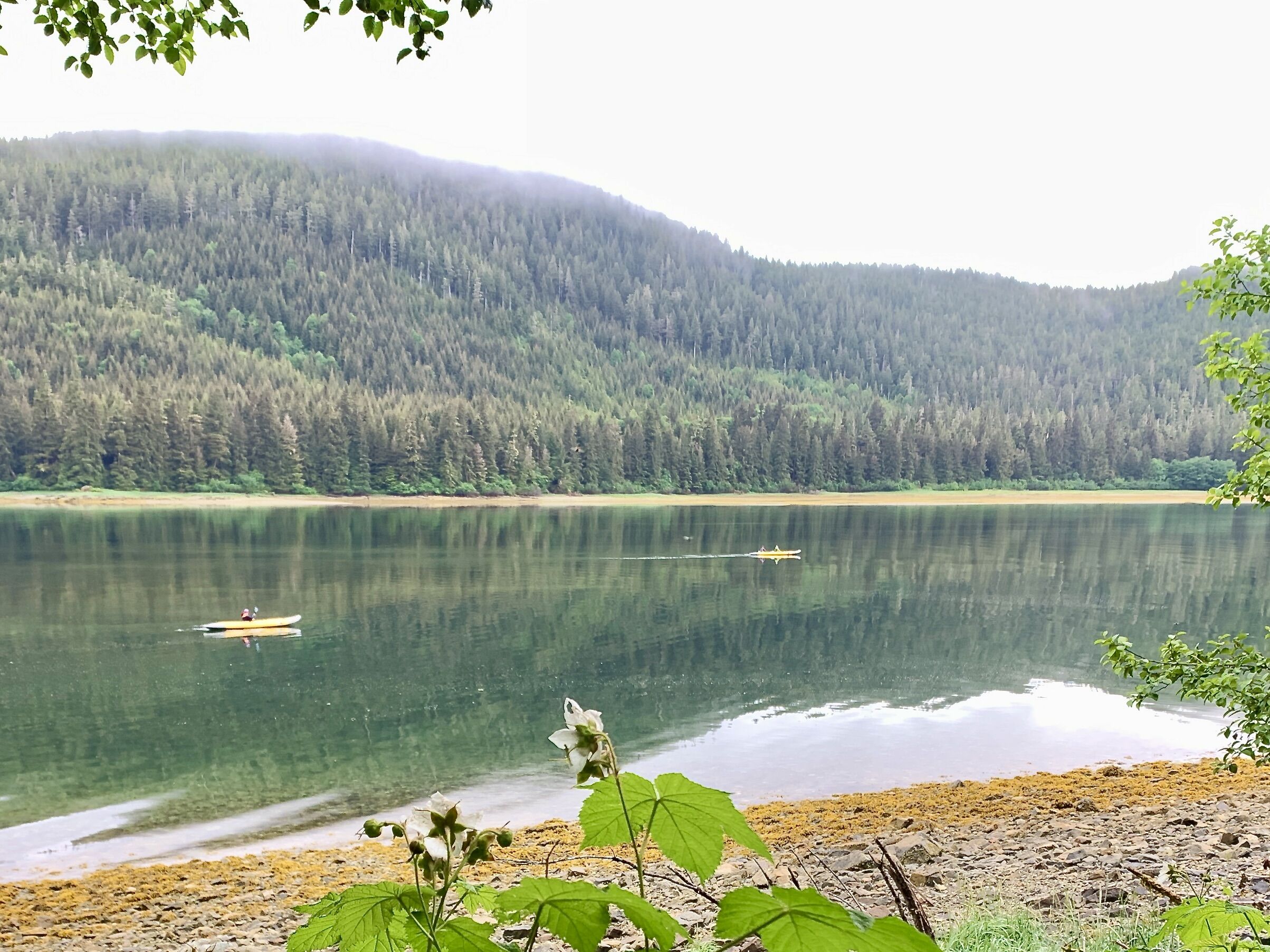 The Keku archipelago is full of life, and we found all manner of excitement during our morning exploring these islands in our expedition Zodiacs. Marbled murrelets, belted kingfishers, pigeon guillemots, and bald eagles flew nearby as we poked our noses into all the nooks and crannies of the islands covered in forest and flowers. Jellies and pteropods floated through the kelp forest while sea otters and harbor seals bobbed around nearby, but the humpback whales gorging themselves on bait balls just offshore truly stole the show. It was truly a case of not knowing where to look, but not really caring because there was something magical to see in every direction! After lunch, some of our more daring guests went for a dip in the chilly waters before we started heading out to Frederick Sound where we may have had the highlight of the day: we found some northern resident killer whales from the R5 matriline! We watched this family group for a while before going our separate ways in the peaceful, flat, calm waters.