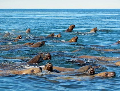 After leaving Sitka yesterday evening, the National Geographic Sea Bird entered the narrow waterways of Alaska's Inside Passage, traversing Peril Strait which separates the large islands of Baranof and Chichagof. A few who stayed up late reported a beautiful full moon. The pull of that moon was evident in the massive tidal range that we witnessed today: a fifteen-foot change from the morning low to the afternoon high. In the early morning, we were in Chatham Strait, along the east coast of Baranov Island, discovering the joy of a steaming mug of coffee on the foredeck, looking for birds and watching Alaska go by. Humpback whales spouted in the distance, rising to the surface to breathe and then returning to the depths to feed. We poked our bow at a beautiful waterfall bringing snowmelt from the mountains above, and we cruised into Kelp Bay searching for wildlife on the shore.