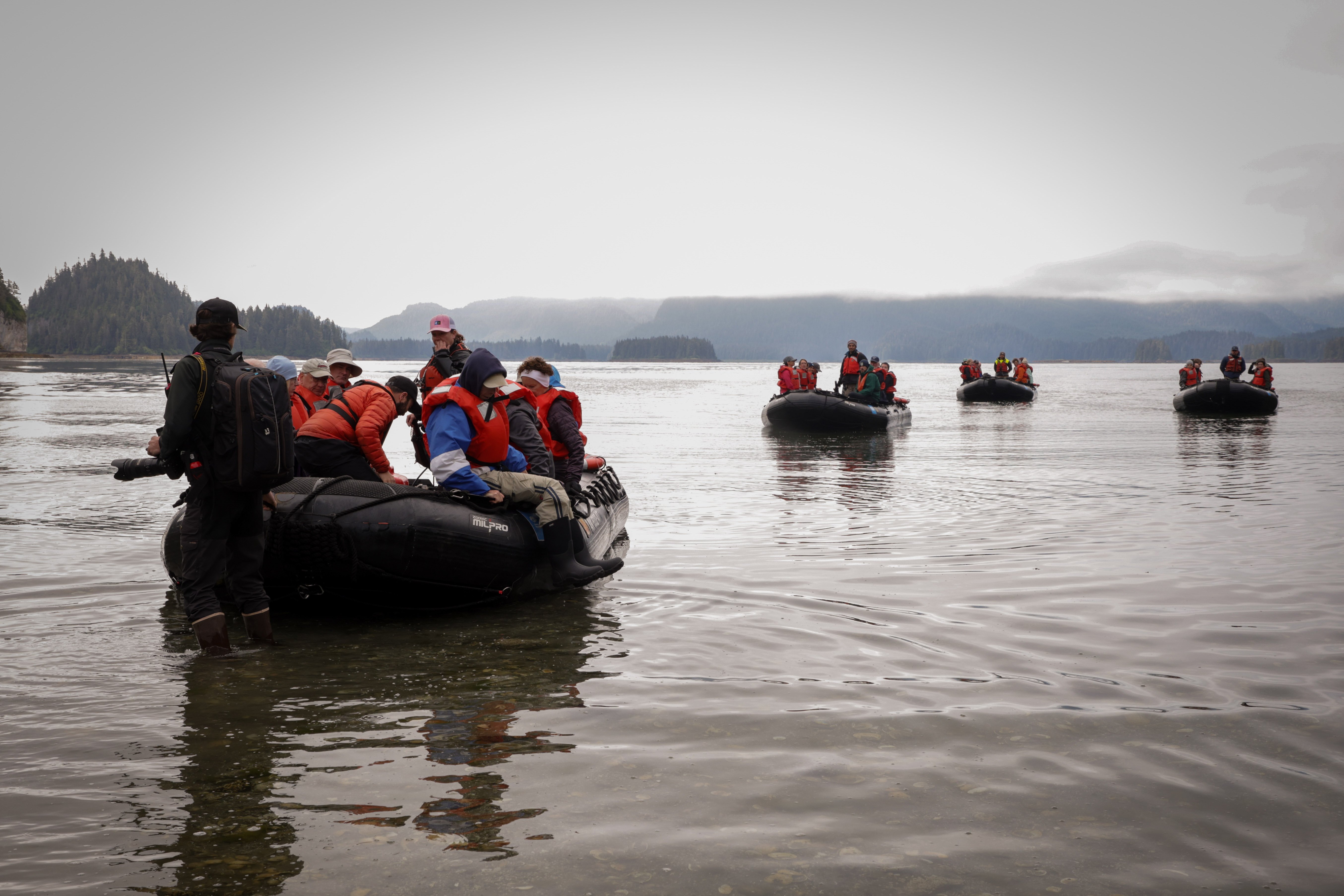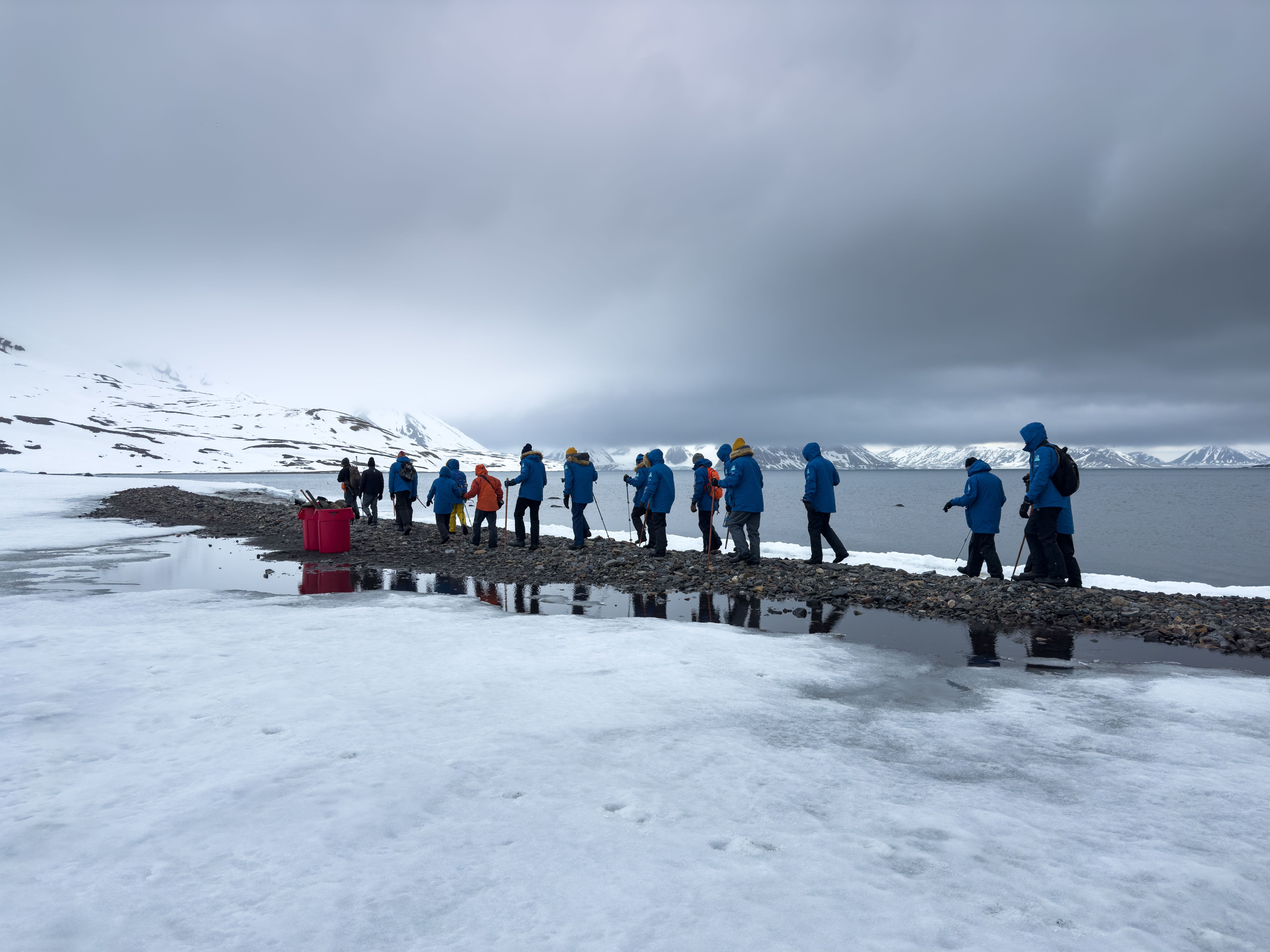 During the night, National Geographic Resolution traveled quite a distance along the northwestern parts of Spitsbergen and in the morning stopped near Sarstangent, a narrow and long sand spit where walruses often haul out. The scouting from the bridge confirmed their presence. For the morning activity, guests were offered landing with, visiting, and observing the walruses resting on the beach. From time to time some of the walruses, probably well rested, moved away and disappeared in the water, others replaced them, coming from the water and joining the group on the beach.