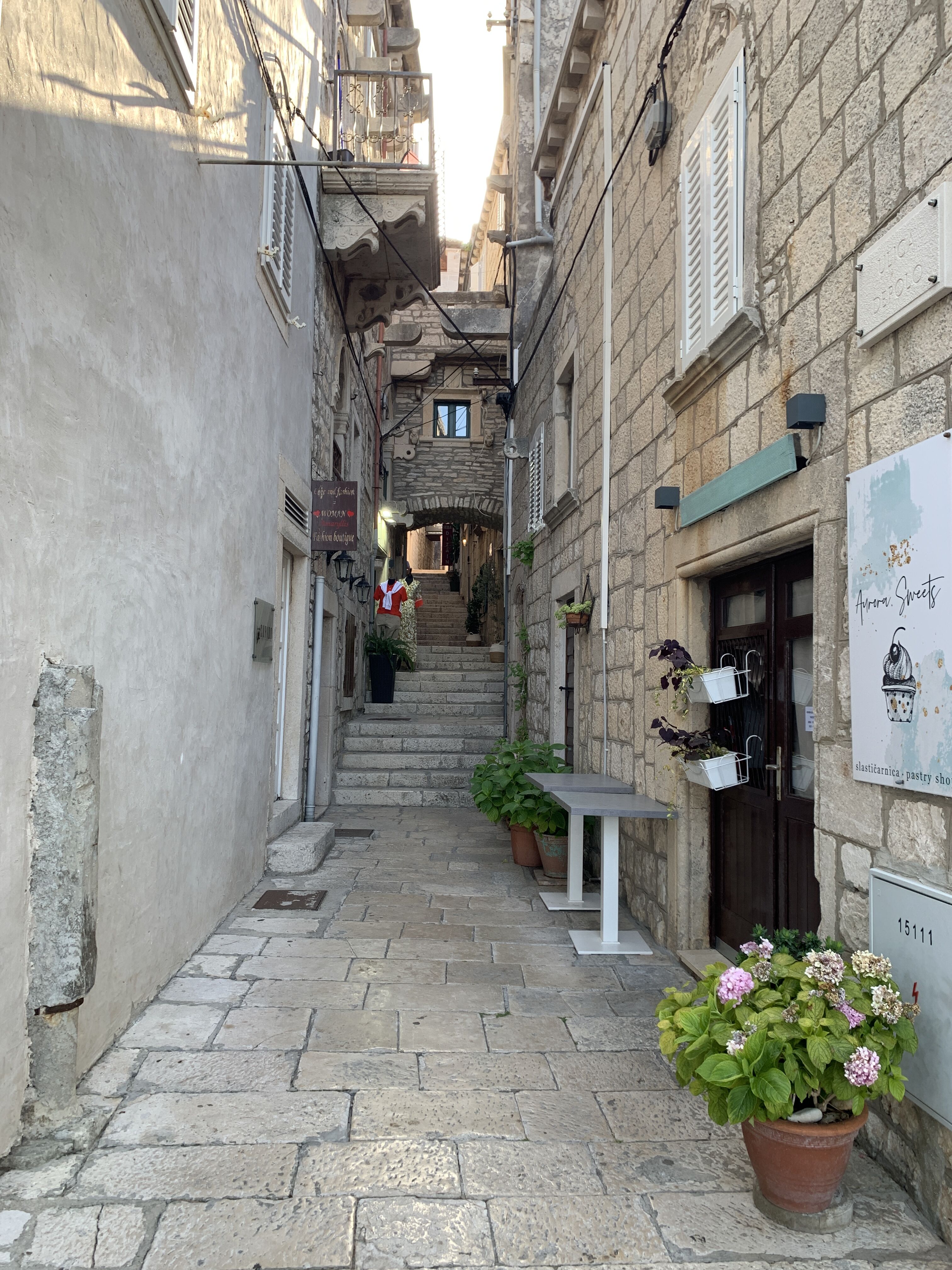 After landing at Kotor, we took buses to the tiny baroque town of Perast. Then we went by a small boat to the rocky island of Gospa od Skrpjela, the Church of Our Lady of the Rocks. Long ago, two fishermen discovered an idol of the Virgin Mary in the shallows and determined it was a sign that a church had to be built on that very spot. At that time, however, the only exposed ground was a very small outcropping, barely above the tideline. Over several centuries, local seafarers and fisherman dropped off large rocks. Eventually, an island of significant size was formed, and a church was built with an altar made of marble of different colors, shipped all the way from Venice. We enjoyed the beautiful paintings, gifts, and the views: in all directions, the mountains, and in all directions, the sea. We returned to visit Kotor itself, to go through the gate and explore its narrow streets, many churches, and eclectic shops.