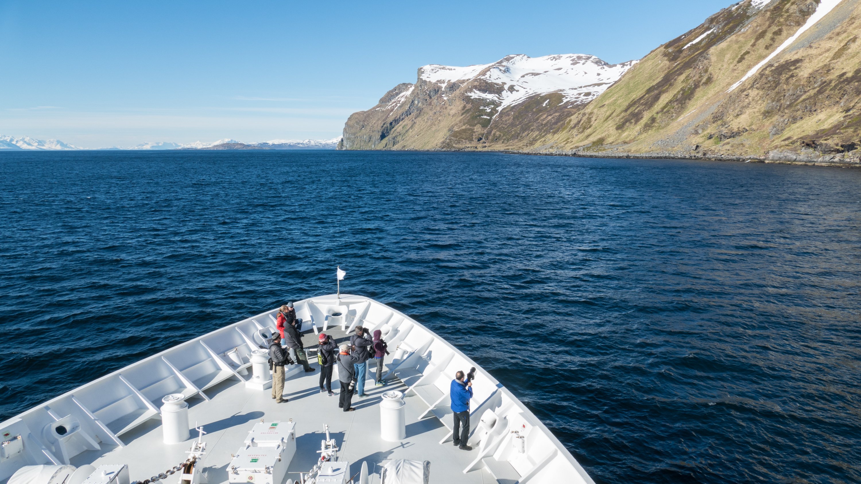 After a steamy frothy espresso and some toe-touching with our wellness specialist, our blood was flowing properly, and we were ready for another day in the Great Land. Diners were joined for breakfast today by a humpback whale cow and calf engaged in restful “logging” activity, setting the stage for a serene morning sail. They turned out to be the first of many majestic M. Novaeangliae we would encounter, most being much more active. We soon found ourselves approaching Morris Reef, and surrounded by not one, but two groups of humpbacks engaged in cooperative bubble-net feeding behavior! We spent time with both pods, viewing and photographing many spectacular lunges, with up to nine of these leviathans’ gaping maws breaking the surface simultaneously and in tightly choreographed formation. Our Global Explorers were then given an opportunity to receive Zodiac driving lessons from our USCG-licensed captains. All souls returned. We continued into the storied seven-mile-long Sitkoh Bay. Here we hiked an old logging road; amongst towering Sitka spruce, frequent bear signs, black-tail deer, and banana slugs galore! Once the wind abated, we also had the opportunity to launch our kayaks and enjoy a leisurely paddle in the bay, with views of National Geographic Venture , bald eagles, and an early 1900s cannery sight. At the end of the day, the ship embraced our return with cocktails, charcuterie, and conversation. A typically highly succulent dinner was followed by a night-capping presentation on birds of the region from our resident ornithologist.