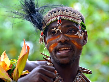 In the afternoon, we returned to shore to drive inland to the village of Haya. We were given an interesting tour of some village homes, and then the Ui family clan put on a visually stunning sing-sing performance. Men and young boys were oiled with the rusty orange dye from the Bixa plant seeds mixed with coconut oil. The men wore feather headdresses and necklaces adorned with circular boar teeth. Beating drums rhythmically, they chanted and danced as several women and girls sang accompaniment from the fringes of the main show. Typical of the other performances we’ve seen, other locals also gathered to watch the festivities. We returned home to the Oceanic Discoverer, tired but sated from a rewarding day of exploration.
