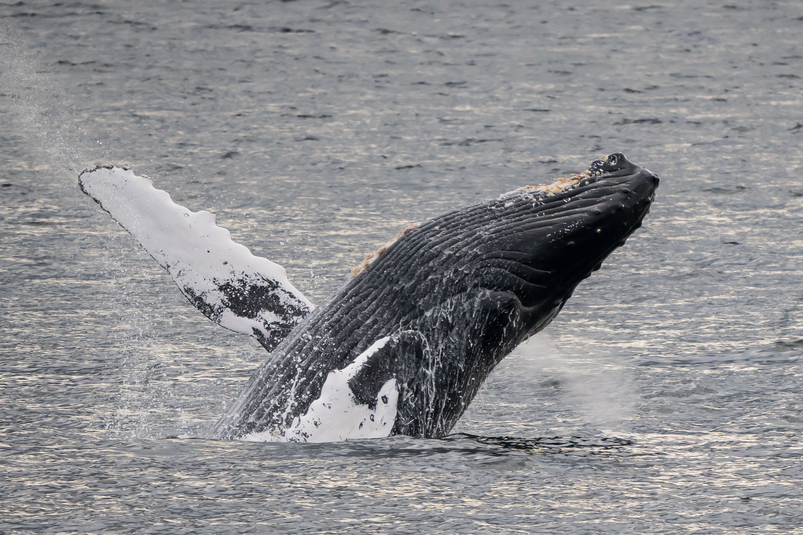 As we continued our way north through Alaska, we had a favorite stop of mine in Tracy Arm-Fords Terror Wilderness. We had a rainy day, which I enjoy because we can see at higher elevations since the rain turns to snow and, in turn, the snow feeds the absorption zone of the Sawyer Glaciers. We went out in the Zodiacs and navigated around the icebergs and bergy bits, even collecting a piece for the ice melt-off challenge. Once underway out of Tracy Arm, we saw some humpback whales. One whale had an entanglement of line on its fluke. The line was causing an obvious cut to the marine mammal. The correct authorities were notified about the condition of the whale and location of the sighting. Hopefully the whale will be assisted soon and the entanglement removed. Several other humpbacks were seen shortly after, luckily no entanglements on these. They were demonstrating surface feeding behavior, with one lunge feeding and the other making bubbles to catch its prey.