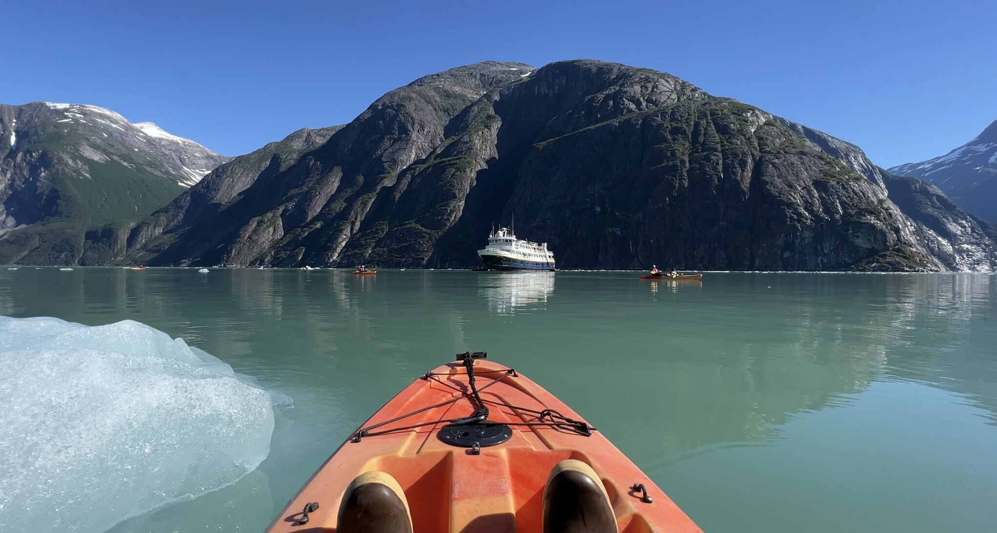 Today we woke up to our first sunny day in Southeast Alaska. We spent the morning exploring Pavlof Harbor, which is a great place for watching the salmon that just started running upstream in the Pavlof River. Some guests hiked to the waterfall for a relaxing morning on the tidelines, others paddled the harbor via kayak and stand-up paddleboard, while others toured the bay on Zodiac rides. After our action-packed morning, we headed out to Chatham Strait, where we cruised for wildlife, spotting harbor porpoises, seabirds, and humpback whales. We ended the day with cocktails on the bow and got one last showing of humpback whales that breached off the bow of National Geographic Venture as the golden hour began.