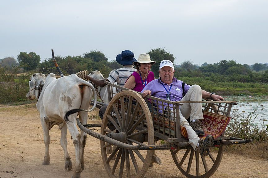 Today was our last full day in Cambodia and our chance to explore the city. After breakfast we stepped off Jahan and explored the downtown city with local cycle rickshaw called a cyclo (pronounced see-clo). With one person per cyclo cab, we moved en masse providing a sight for locals as much as the city was for us. Our experienced and confident cycle drivers navigated busy traffic and weaved a path towards the temple of Wat Phnom. This Buddhist temple meaning mountain Pagoda in Khmer language stands 27 metres tall and was built in 1372. The beautiful gardens that surround with tall evergreen trees provided a peaceful place for reflection ahead of our busy day.