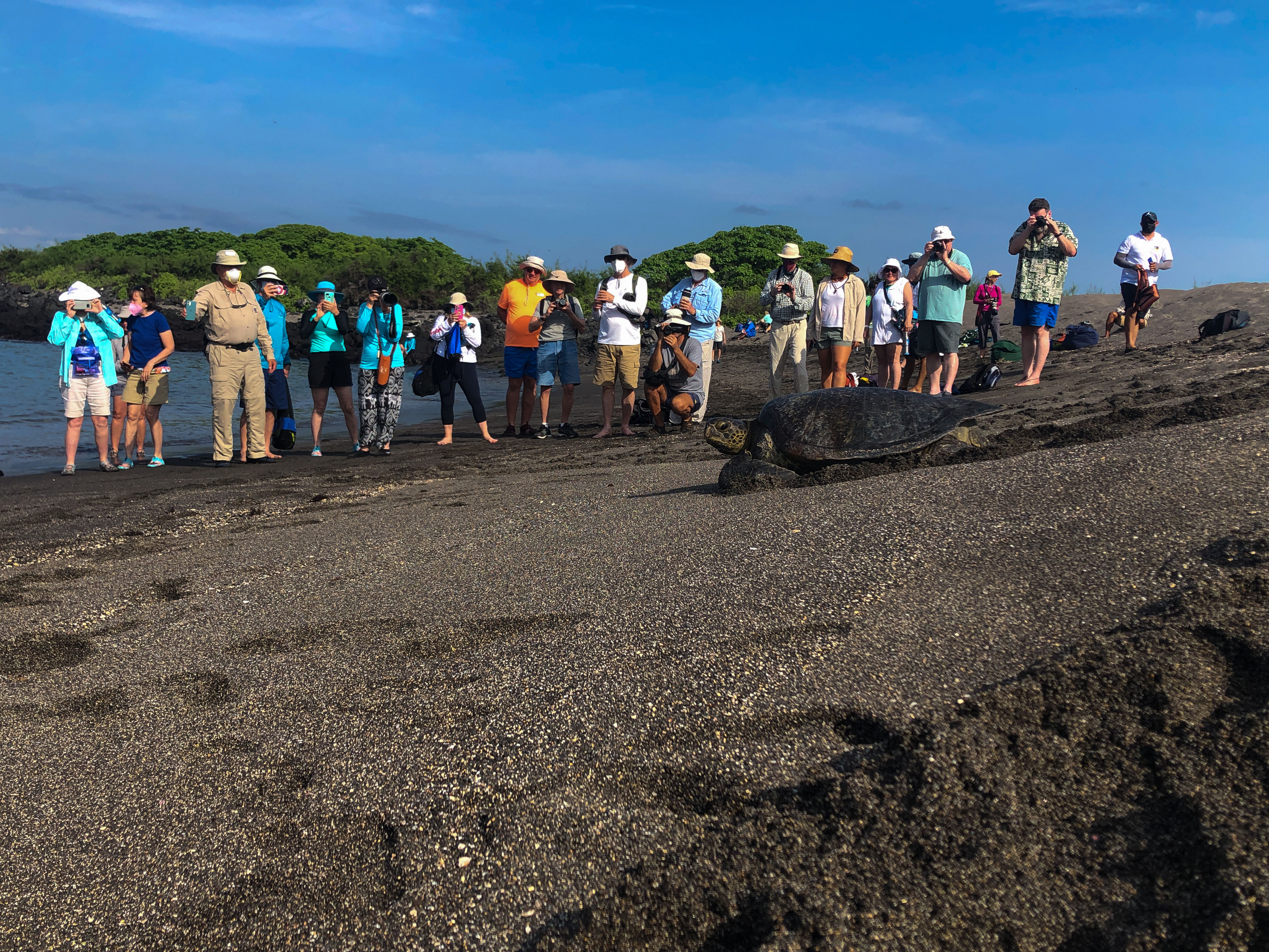 Shortly after, we observed a second dolphin species frolicking in the distance–common dolphins. The icing on the cake came just a few minutes later when we enjoyed a wonderful encounter with the rarely seen short-finned pilot whales. The whales swam placidly alongside National Geographic Islander. The sighting was so spectacular that most of the ship’s crewmembers joined our guests and natural history staff to observe. We were all so excited and joyful! What a magical event!