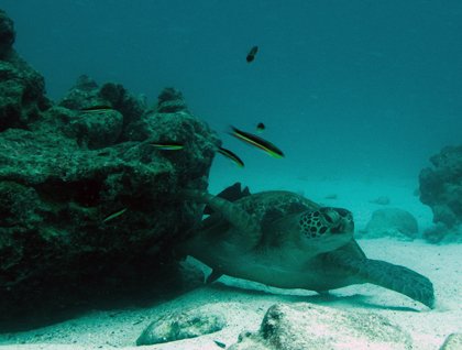 At around 3:00 p.m., we anchored close to Sombrero Chino and the Bainbridge Islets. These interesting small volcanoes were probably formed when the sea level was lower, as parasitic cones of Santiago or James Island. Soon we dropped anchor near Chinese hat and went snorkeling off the coast of the young lava fields of Santiago island. We had an incredible time in the water, followed by a Zodiac ride around the same snorkeling area, but this time to photograph Galapagos penguins and other shore birds with the golden light of the equatorial sunset.