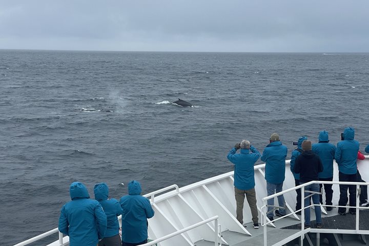 Guests aboard National Geographic Explorer were welcomed to Drangey Island in Skagafjordur with an ethereal fog blanketing the entire island. Although it was a lovely and magical scene, all aboard had their fingers crossed that the fog would lift, and our patience was rewarded with a bit of sunshine to bathe us in a bit of warmth just before starting the morning operations. Some hearty guests opted to scale the rugged island itself by foot, in hopes of getting up close and personal to the plethora of sea birds nesting on the Drangey. Others opted to circumnavigate the island by Zodiac and were rewarded with breathtaking views, thousands of sea birds flitting here and there, several gray seals peering up from the dark waters, and even a couple of whales graced the Zodiacs with their majestic presence.
