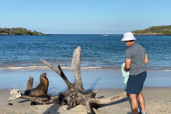 During the afternoon, water activities took place on Santa Fe Island, and snorkeling with sea lions was such an incredible sighting for our guests. Later in the afternoon, we disembarked to a large colony of sea lions on the beach, put on our good walking shoes, and went to explore the rest of the trail, where pale land iguanas, mockingbirds, and other species could be observed and photographed. The highlight of the afternoon was for sure a couple of Galapagos hawks that were flying in the area.
