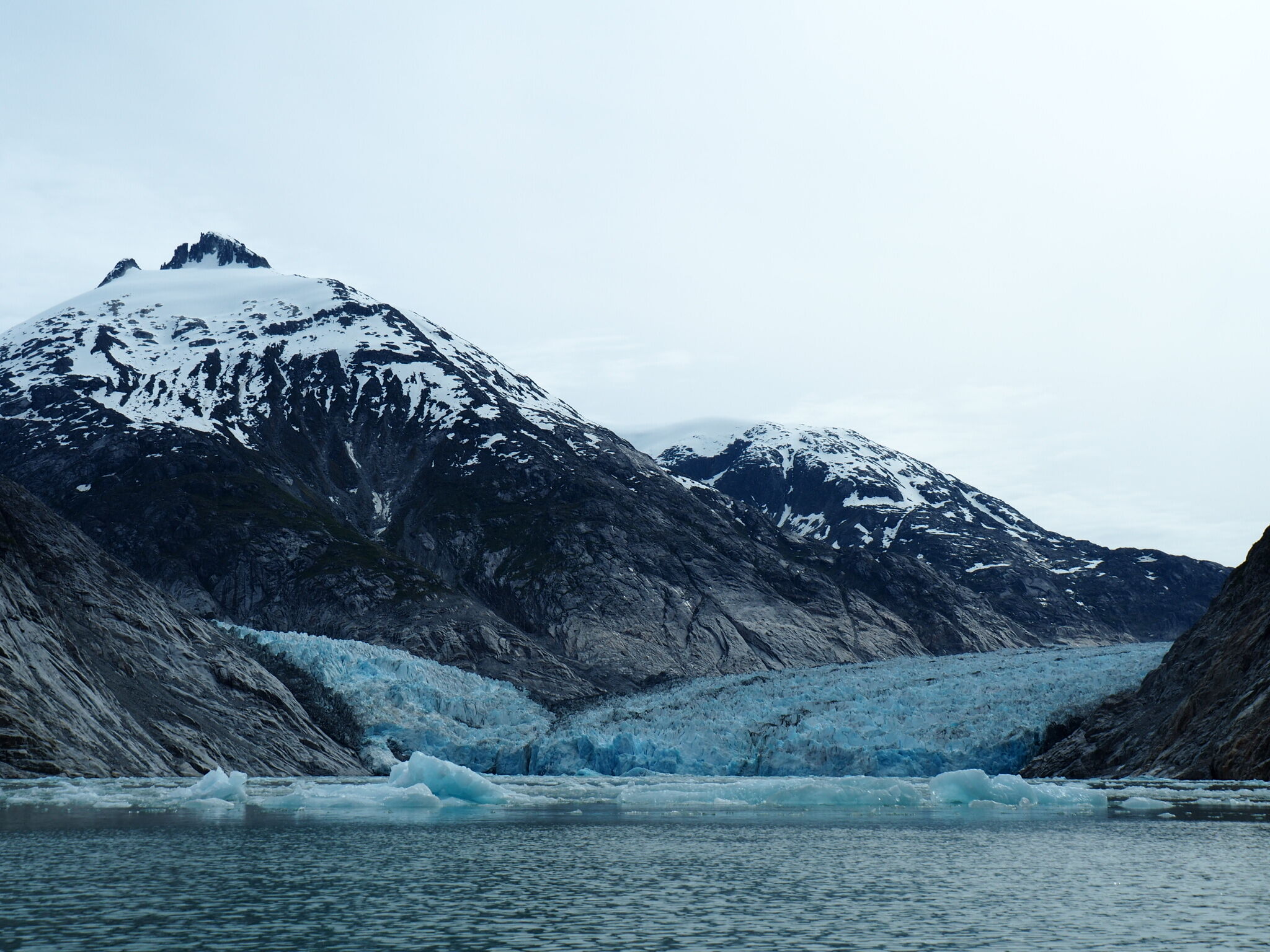 Dawes Glacier, located at the head of Endicott Arm in Southeast Alaska, is an active tidewater glacier in the remote Tracy Arm-Fords Terror Wilderness Area. Reaching the glacier requires a 30-mile journey through a narrow fjord lined with sheer rock walls rising over 3,000 feet. These cliffs are veined with waterfalls and often blanketed in mist. Throughout the fjord, remnants of the glacier float in the form of icebergs. The glacier feeds cold, silty meltwater into the fjord, giving the water a distinctive milky-green hue and supporting a rich marine food web. Harbor seals were hauled out on ice floes near the glacier. Gulls and Arctic terns were actively feeding, likely drawn by the small fish and plankton concentrated by the glacial outflow. The glacier calved several times, hurling large chunks of ice across the water’s surface, sending the birds fleeing. The sound of the ice hitting the water echoed off the steep rock walls that rise thousands of feet on either side.