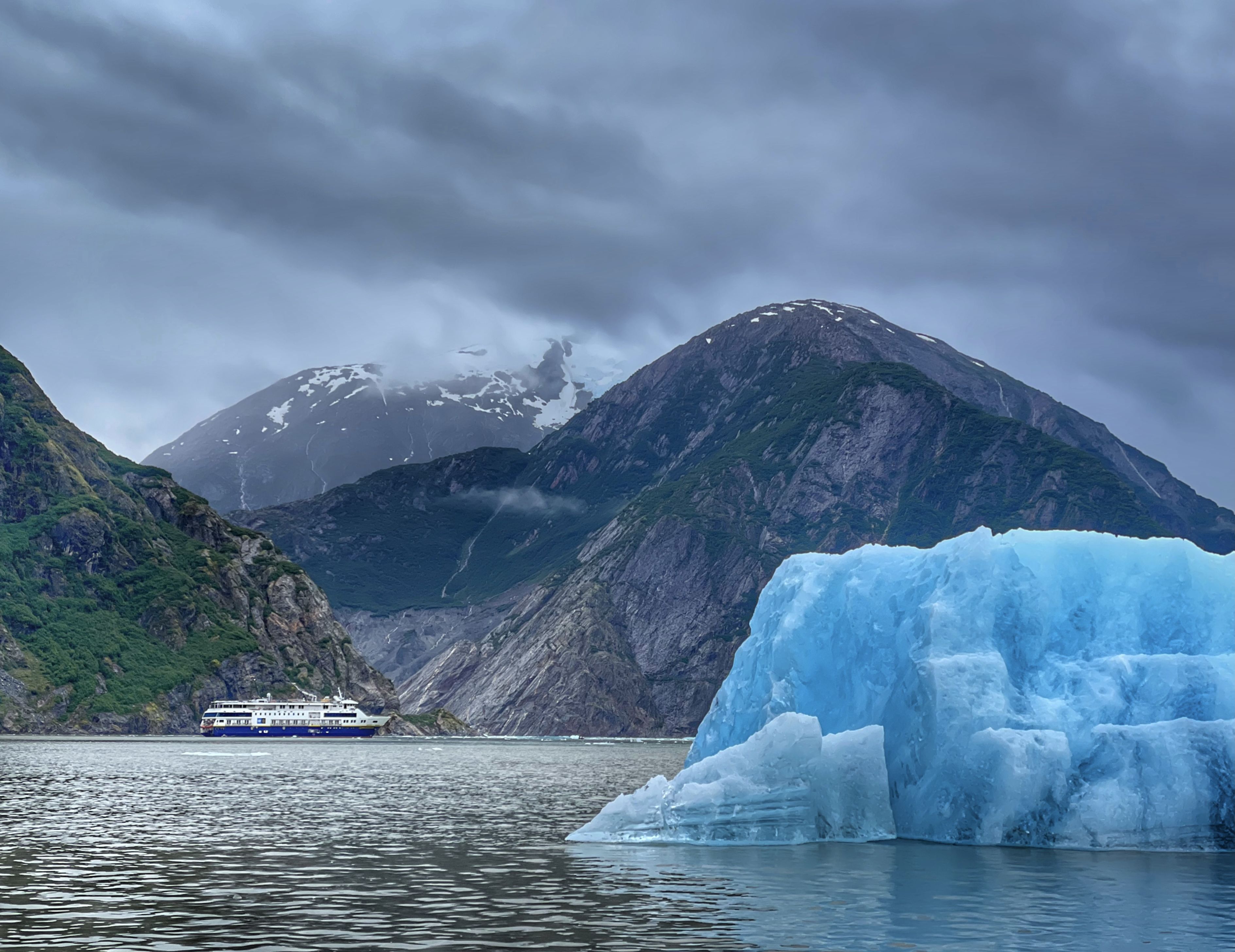As we continued our way north through Alaska, we had a favorite stop of mine in Tracy Arm-Fords Terror Wilderness. We had a rainy day, which I enjoy because we can see at higher elevations since the rain turns to snow and, in turn, the snow feeds the absorption zone of the Sawyer Glaciers. We went out in the Zodiacs and navigated around the icebergs and bergy bits, even collecting a piece for the ice melt-off challenge. Once underway out of Tracy Arm, we saw some humpback whales. One whale had an entanglement of line on its fluke. The line was causing an obvious cut to the marine mammal. The correct authorities were notified about the condition of the whale and location of the sighting. Hopefully the whale will be assisted soon and the entanglement removed. Several other humpbacks were seen shortly after, luckily no entanglements on these. They were demonstrating surface feeding behavior, with one lunge feeding and the other making bubbles to catch its prey.