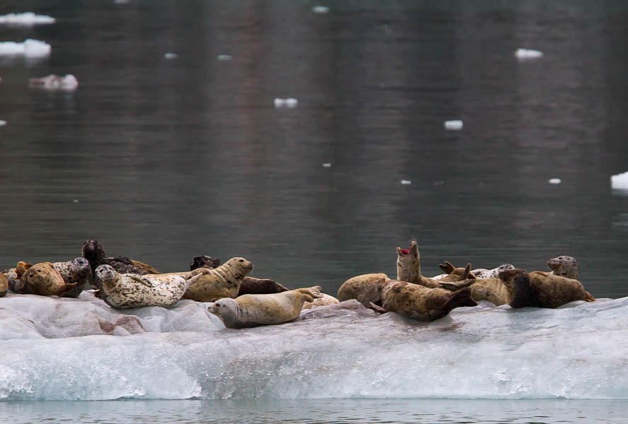 Dawn light crept through the low clouds to find the National Geographic Sea Bird steaming towards Tracy Arm-Ford’s Terror Wilderness. We crossed over the 1500-year-old sandbar that marks the old terminal moraine of the glaciers we sailed towards and icebergs began appearing in the waters around us. Before breakfast we snaked our way down the Tracy Arm fjord with steep 2,000 foot cliffs rising above and 1,000 foot depths of chilly water below. We passed countless waterfalls rushing down the steep sides and spied hanging glaciers suspended in the upper reaches of the steep coastal range.