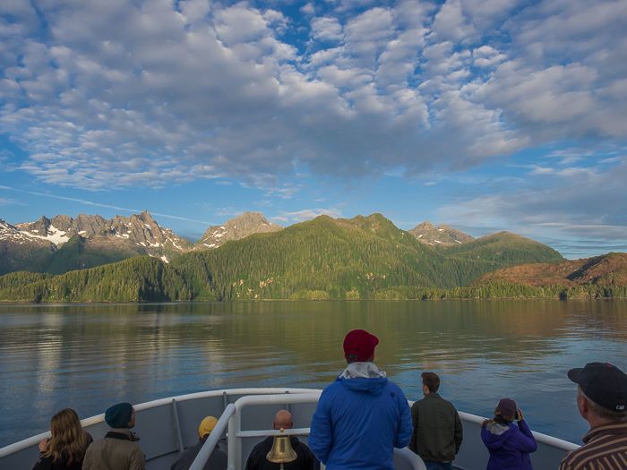 During the morning, we explored the scenic cove of Pavlof’s Harbor on the southeast shore of Freshwater Bay, Chichagof Island, and area known for its healthy salmon stream. We were optimistic that we might still see a bear during our last day exploring Southeast Alaska. We were not disappointed! At the base of a small waterfall, we spotted a coastal brown bear casually gorging itself on salmon as we watched, spellbound, from the safety of our expedition landing crafts only a few yards away. The bear, enjoying its meal, seemed oblivious or at least indifferent to our presence. For nearly an hour, we watched the animal devour fish after fish until it calmly walked up the river bank rocks and into the forest. Late summer and early fall is the time to fatten up and prepare for the long winter ahead. Come November and the onset of snow, brown bears will leave the coastline and head to higher elevations near or above treeline. Biologists debate whether bears truly hibernate or just den up and sleep during the winter. Pregnant sows will give birth to tiny, one-pound cubs while sleeping within the den and nurse them until spring. We returned to the ship after our morning adventures for lunch and were relaxing in the lounge when another bear was spotted on the beach south of Pavlof Harbor. Although more distant than our first encounter, we all enjoyed another exceptional sighting of a coastal brown bear. But the wildlife viewing wasn’t over yet! As we sailed south along Chatham Strait, we encountered a pod of killer whales swimming nearby. Crusing alongside the pod, we counted a group of about ten that included one large male. His large dorsal fin rose nearly six feet above the water‘s surface. Guests spent the remaining time reading or chatting with friends. We wrapped up our day with the captain‘s dinner followed by the guest photo slideshow, which we enjoyed as we sailed toward Sitka through Peril Strait. Have we seen it all? Hardly! But we left with a sense of fulfillment, knowing that we saw a lot! And maybe one day we‘ll return and finally see some elusive moose!